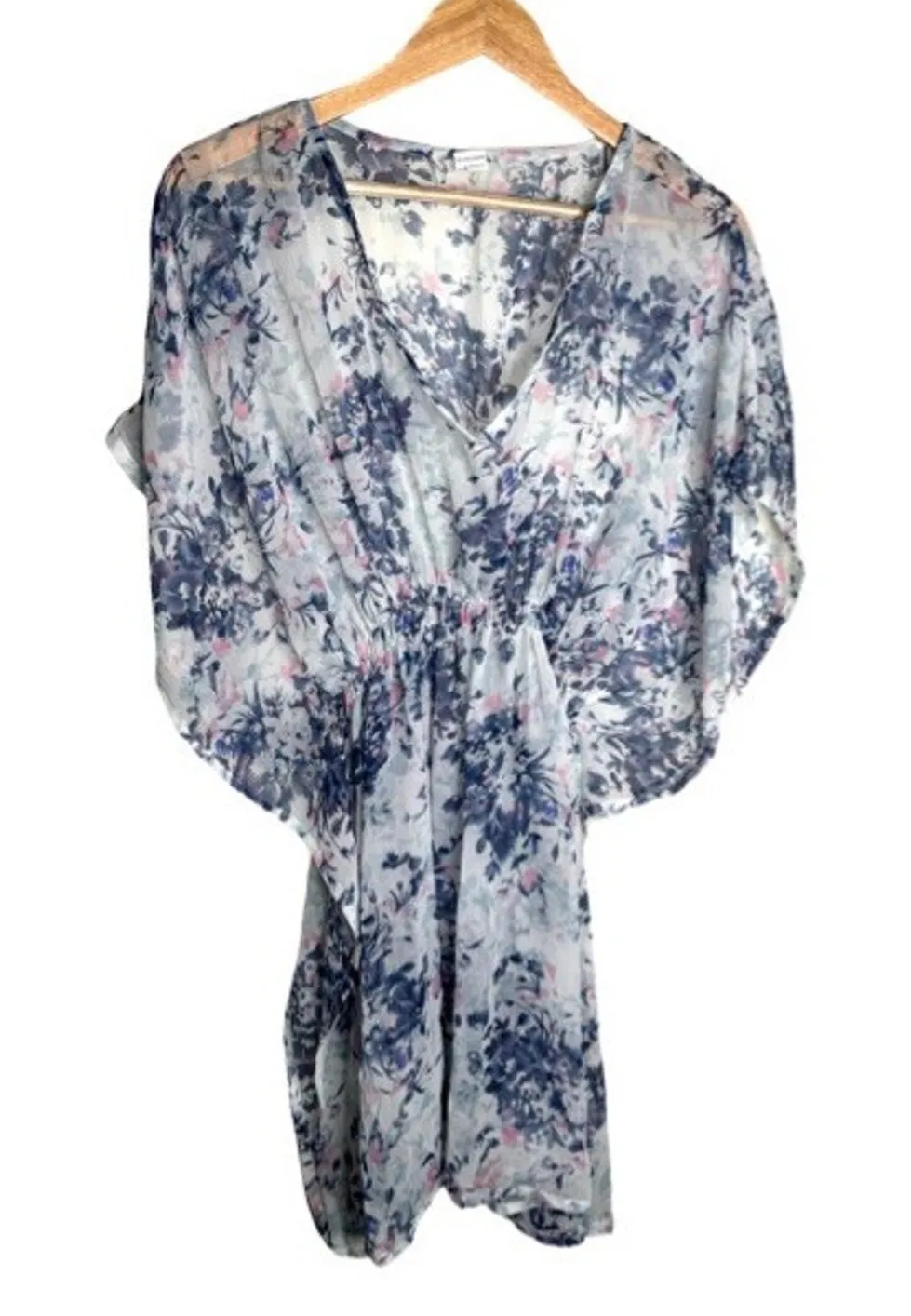 White, blue and pink floral cover up is sheer and features short bat wing sleeves, elastic waist and a v neck. One size. 100% polyester. Pit to pit-up to 24”, Length-34”. Excellent used condition. Open to offers. Same or next day shipping! Floral swim vacation lake spa pool cruise River summer spring
