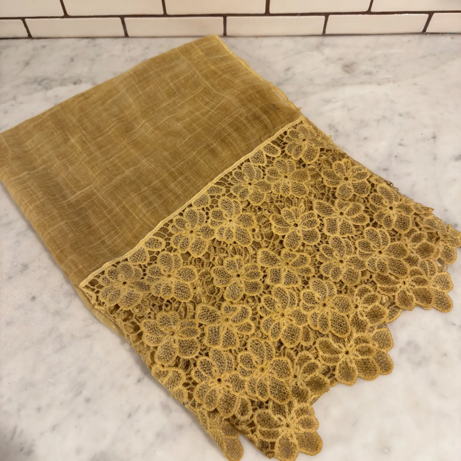 Measurements: • Length: 80 in • Width: 26 in Type: Shawl/Wrap Department: Women Material: Cotton, Viscose Style: Rectangle Scarf Pattern: Floral Theme: Bohemian Fabric Type: Lace Accents: Crochet Garment Care: Hand Wash Only Unit Type: Unit Keywords: sheer scarf, lace trim, gold scarf, tan shawl, lightweight wrap, cotton viscose, bohemian accessory, elegant scarf, fashion accessory, evening wrap, versatile scarf, delicate lace, womens scarf