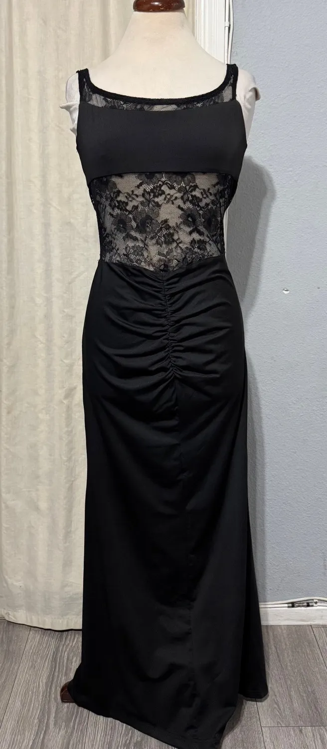 A striking black maxi dress with alluring lace detailing and elegant ruching. This gown features a square neckline with a delicate lace overlay on the bodice, extending to a sheer lace midsection that offers a tantalizing glimpse of skin. The lower portion of the dress is adorned with strategic ruching that accentuates the figure, flowing into a long, sleek skirt. A dramatic cutout at the back is framed by a charming bow detail, adding a sophisticated touch. Perfect for formal events, galas, or a romantic evening out.