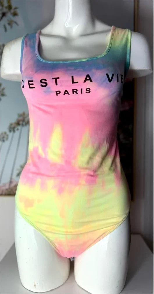 SHEIN C'est La Vie Sorbet Rainbow Tie Dye Verbiage Bodysuit Tank Top Size XL Brand: SHEIN Size: XL... Show more