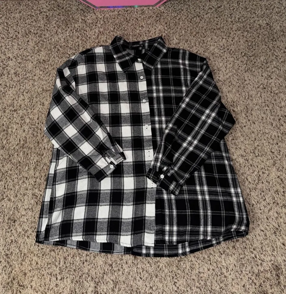 Discover effortless style with this SHEIN CURVE color block plaid shirt. The striking contrast of black and white plaid panels creates a dynamic visual that commands attention. Designed with a classic button-up front and a comfortable collar, this shirt offers versatility for any occasion. Its long sleeves provide a polished look that can be worn down or cuffed. Perfect for a casual day out, a relaxed office environment, or a weekend getaway. Measurements: • Bust: 23 in • Length: 30 in • Sleeve Length: 23 in Type: Button-Up Department: Women Style: Tunic Neckline: Collared Sleeve Length: Long Sleeve Sleeve Type: Classic/Fitted Sleeve Pattern: Plaid Accents: Button Features: Collared Fit: Relaxed Fabric Type: Flannel Occasion: Casual Closure: Button Season: Fall, Winter, Spring Unit Type: Unit Keywords: SHEIN, color block, plaid shirt, button up, long sleeve, womens fashion, casual top, oversized shirt, monochrome, streetwear, trendy, modern, fall fashion, layering piece