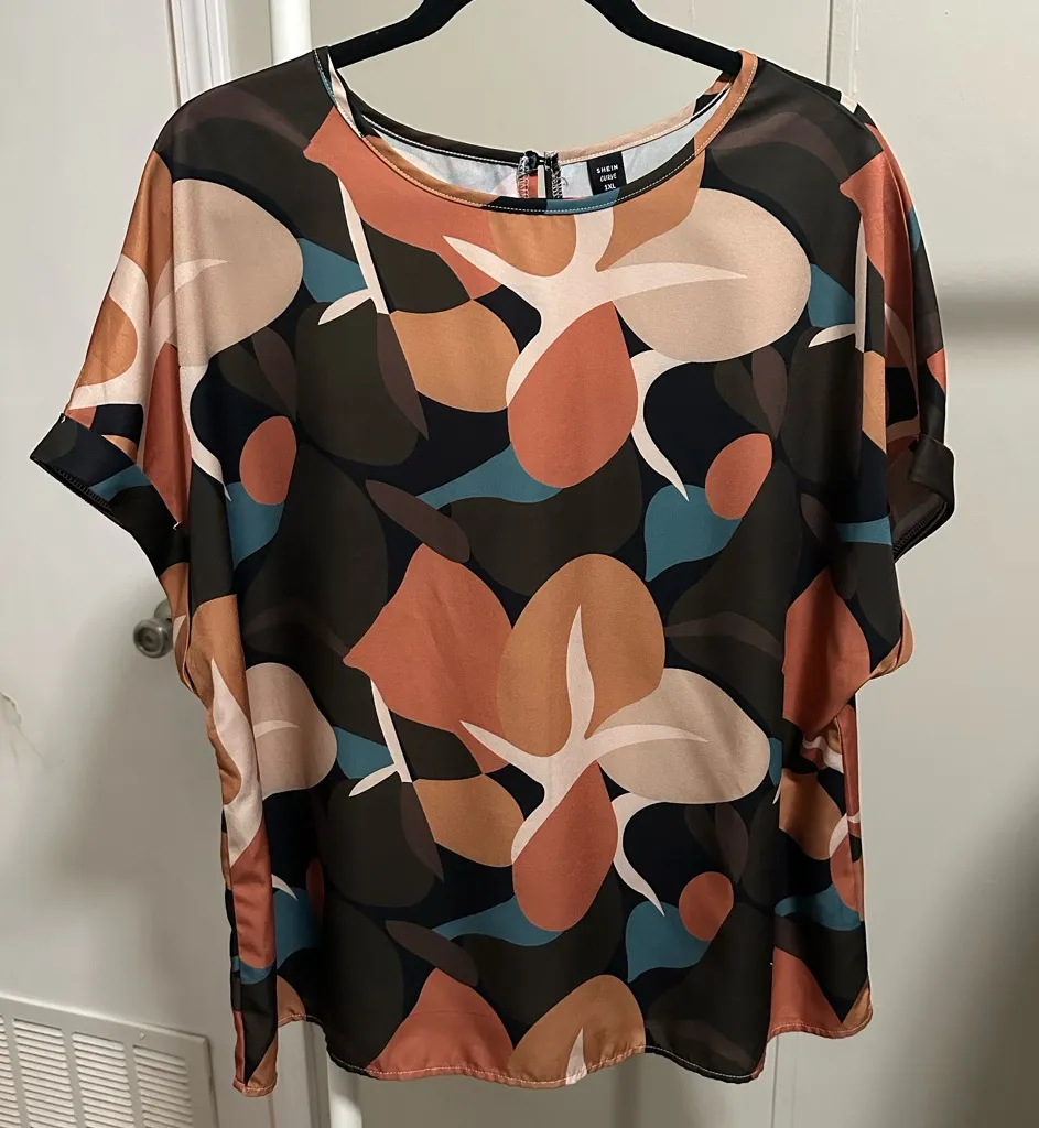 Orange, brown, cream, tan, teal, dark blue abstract design Short sleeve, round neck, button - loop... Show more
