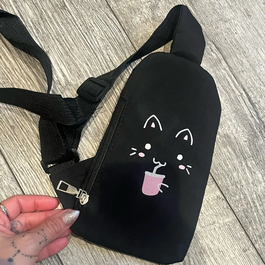 Adorable black sling bag with a cute cat design. Features a pink drink graphic. ITEM IS NEW WITHOUT... Show more