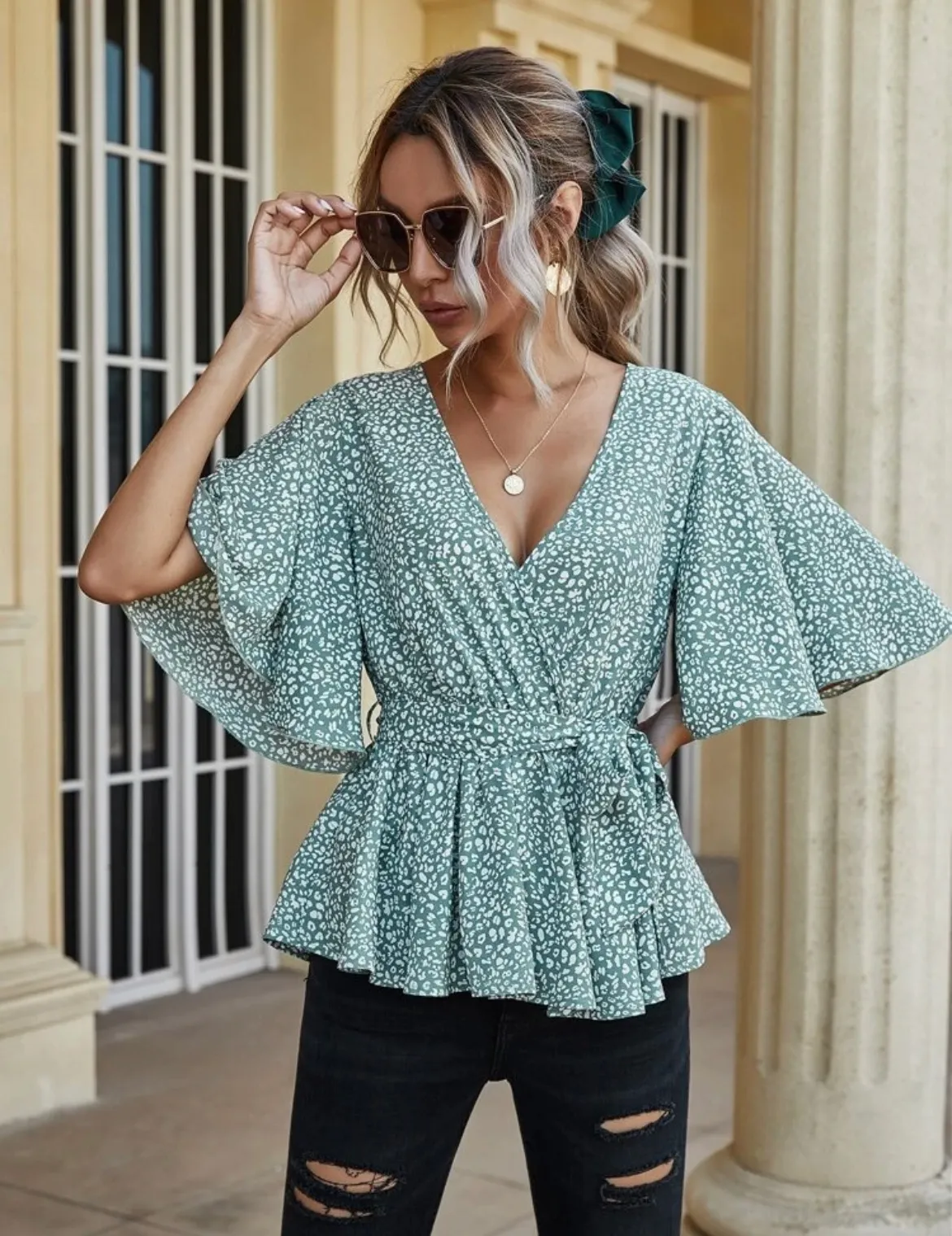 Dalmatian print wrap top with ruffle sleeves, a peplum waist, and a belt! Just ordered this cute top... Show more