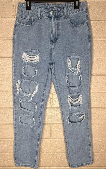Stylish distressed light blue jeans perfect for a casual look. Comfortable and trendy, these jeans a... Show more