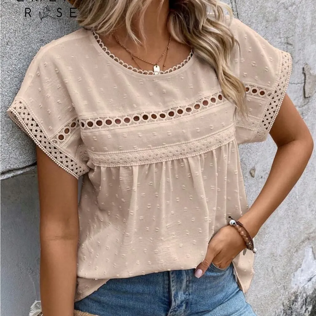 This elegant beige top features intricate eyelet detailing, perfect for a chic and stylish look. Ide... Show more
