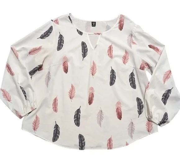 Shein blouse with feather design. White background with pink and black feathers. Cut out at neckline... Show more