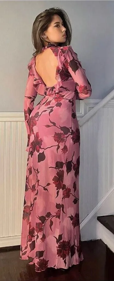 Shein Firerie Women's Vintage Floral Print Bodycon Dress With Ruffle Hem And Bell Sleeves in Pink. T... Show more