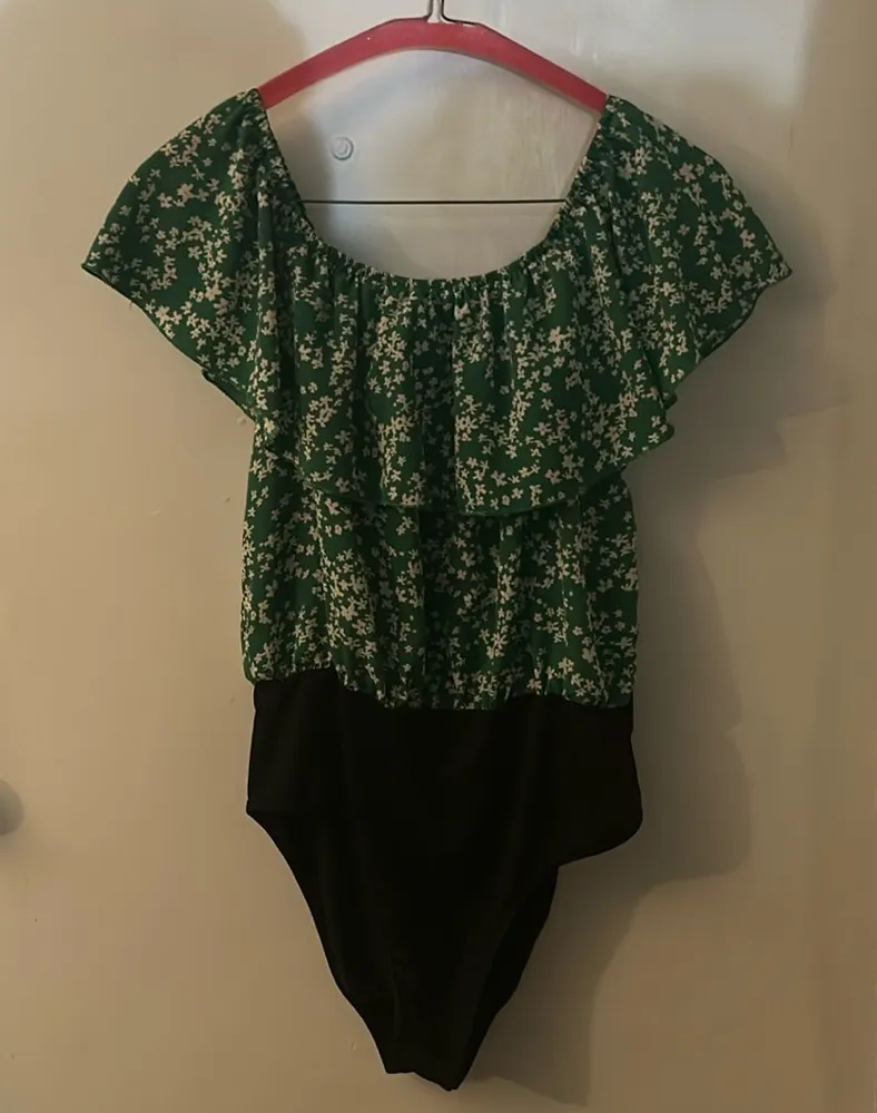 Style: Sleeveless floral crewneck bodysuit Color: Green/White/Black Size: XL /US 12 Armpit: 15” Wai... Show more