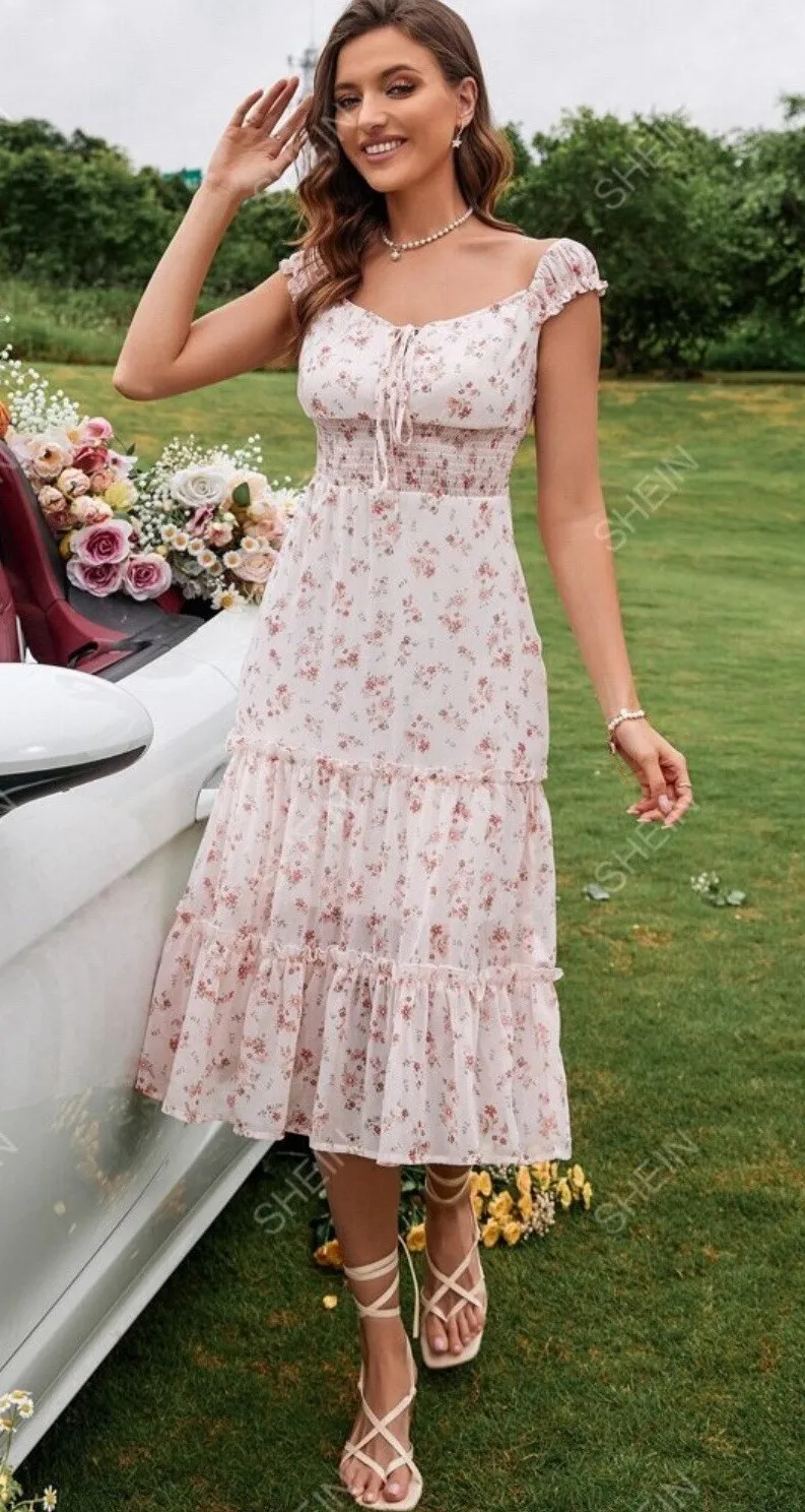 Keywords: floral dress, midi dress, off shoulder, smocked waist, tiered dress, ruffle hem, short sleeve, pink dress, women's fashion, garden party dress, romantic dress, boho dress, summer dress, spring dress