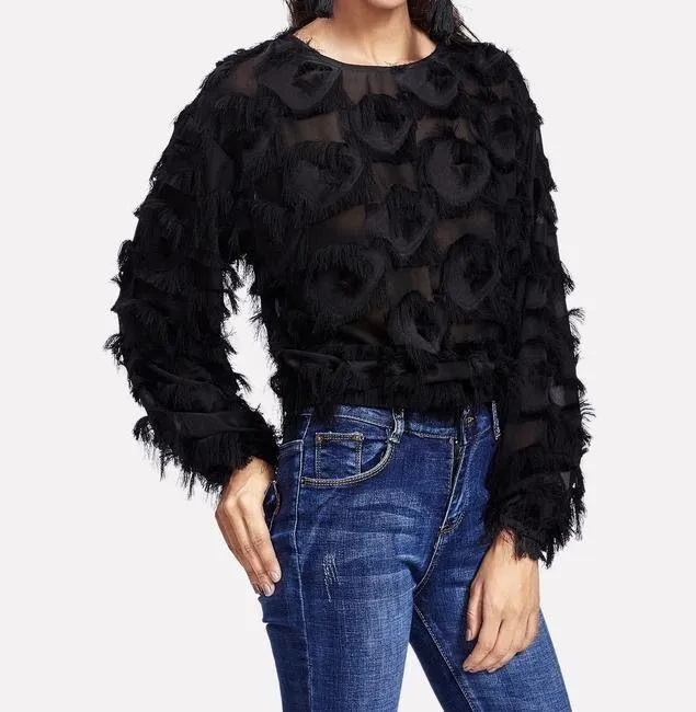 Like new condition. Sheer lace top with fringed patches. Crew neck. Long sleeves. 24” pit to pit x 2... Show more