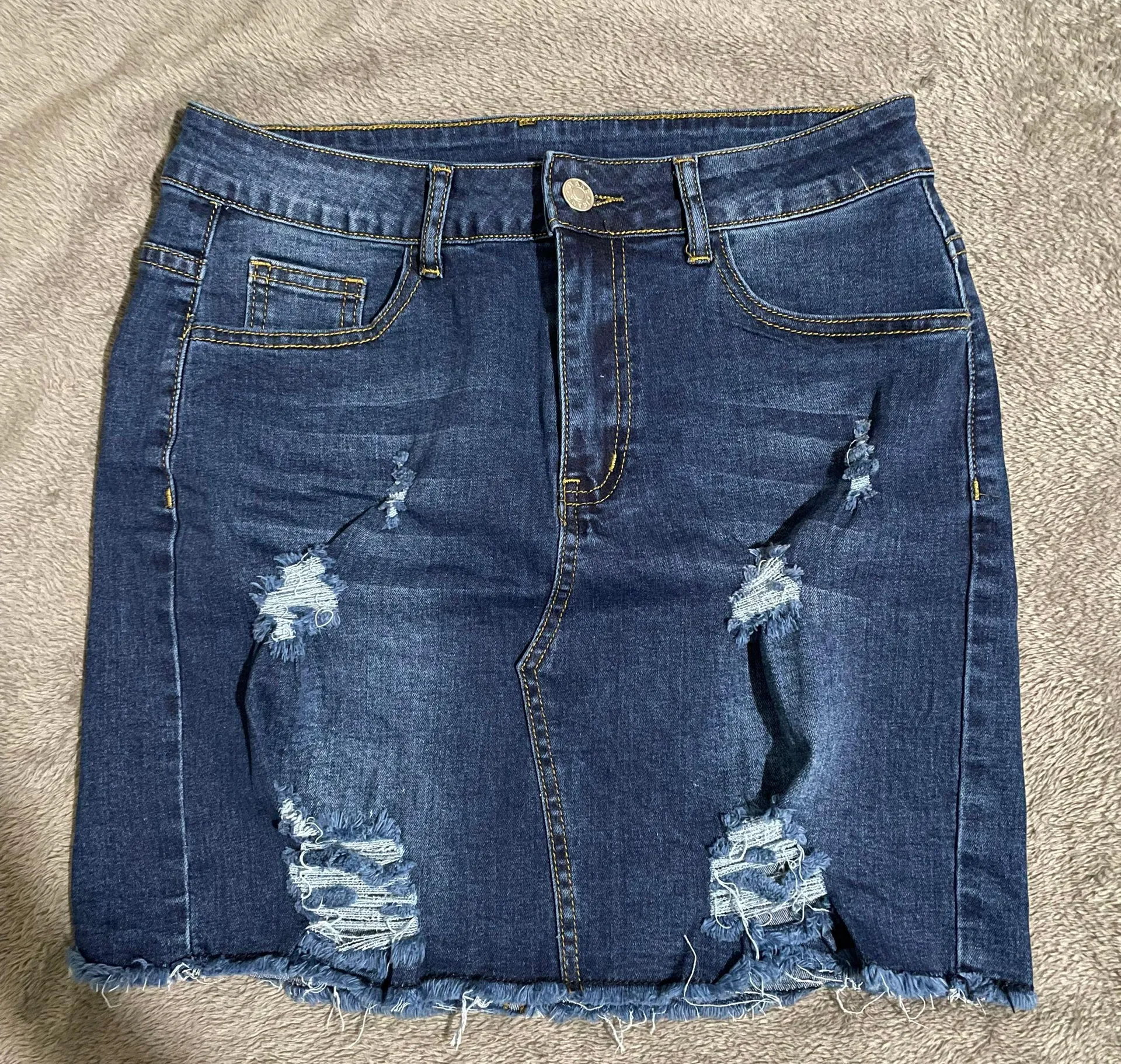 Distressed soft denim skirt Does stretch Wrinkle in front, but that’s just from how it was folded i... Show more