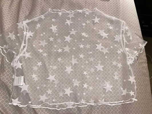 Stretchy and cute with mesh and soft stars. Lettuce trim around arms, neck and waist