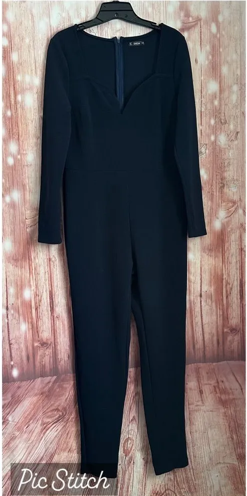 Shein Navy Blue Sweetheart Neckline Long Sleeve Jumpsuit. Fitted through the legs. Approx 18" pit to... Show more