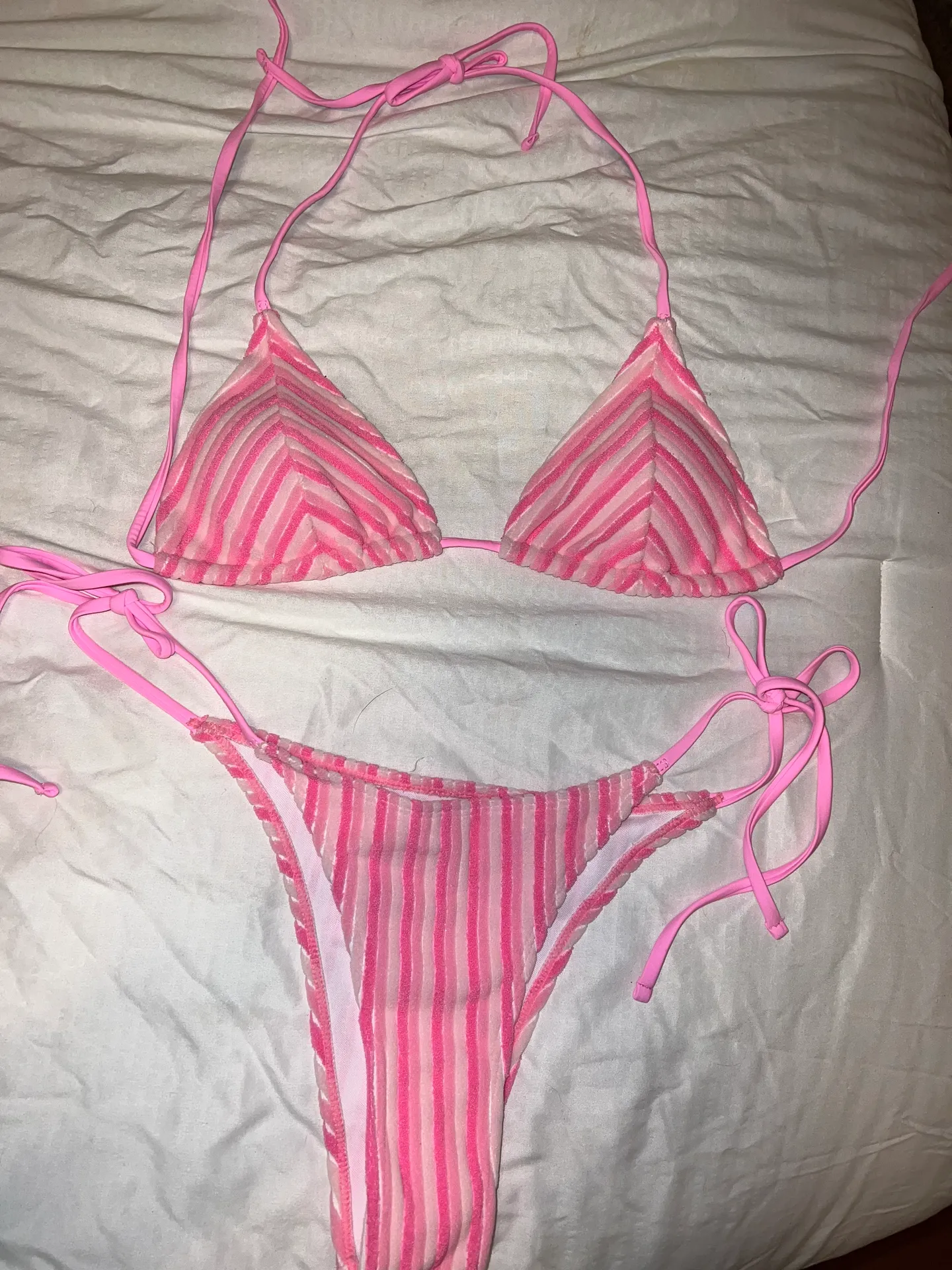 Never worn pink striped swimsuit, cups run a little smaller and bottoms and little big