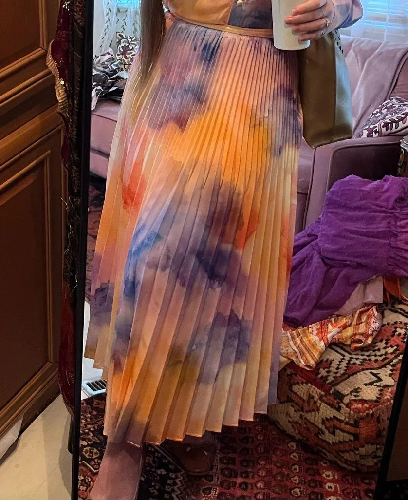 Vibrant watercolor print skirt with purple and orange hues, blue pink and yellow mixed in Pleated S... Show more