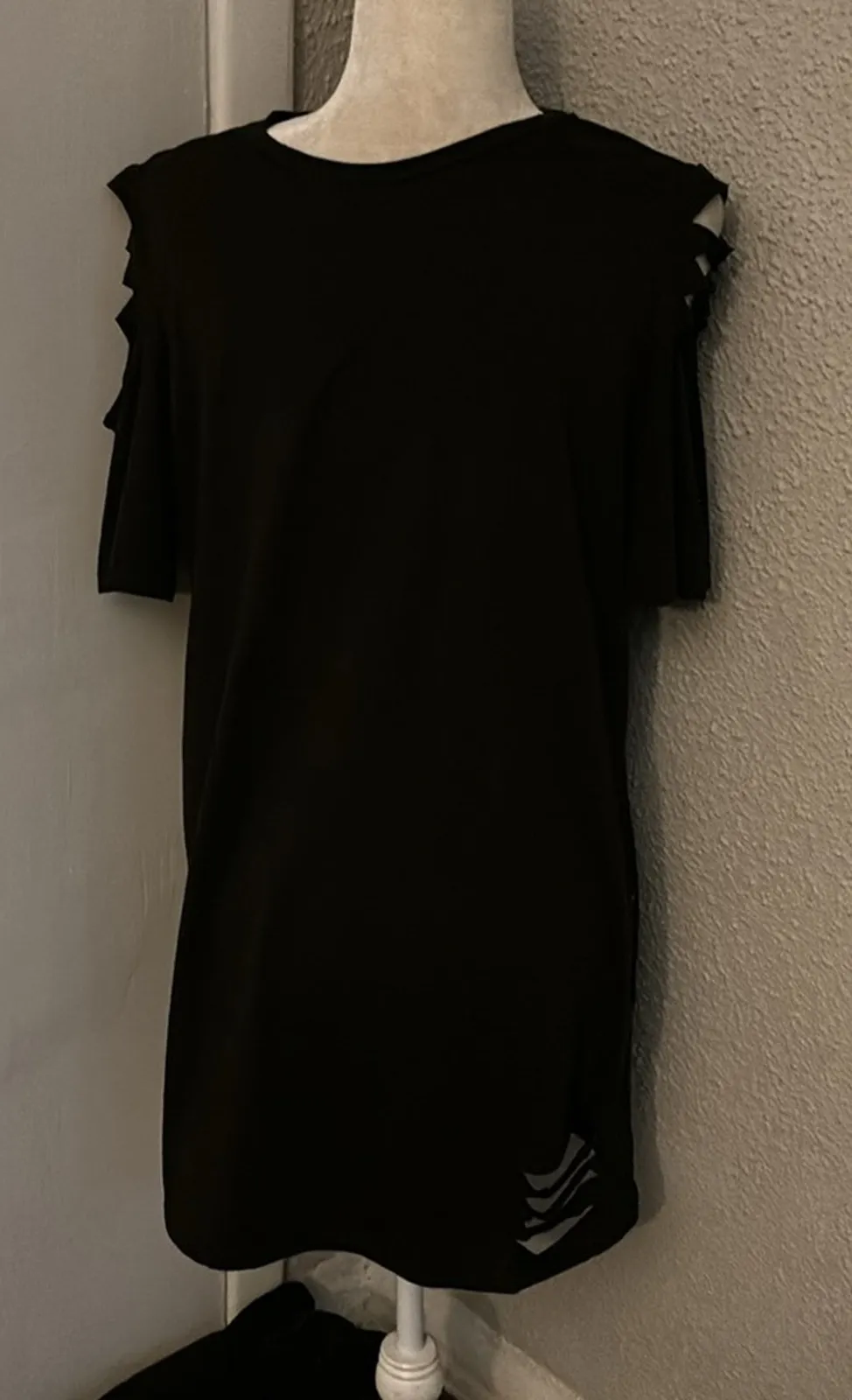 Style: T- shirt tunic shift dress with ripped sleeve and hem accents Color: Black Size: M Armpit: 1... Show more