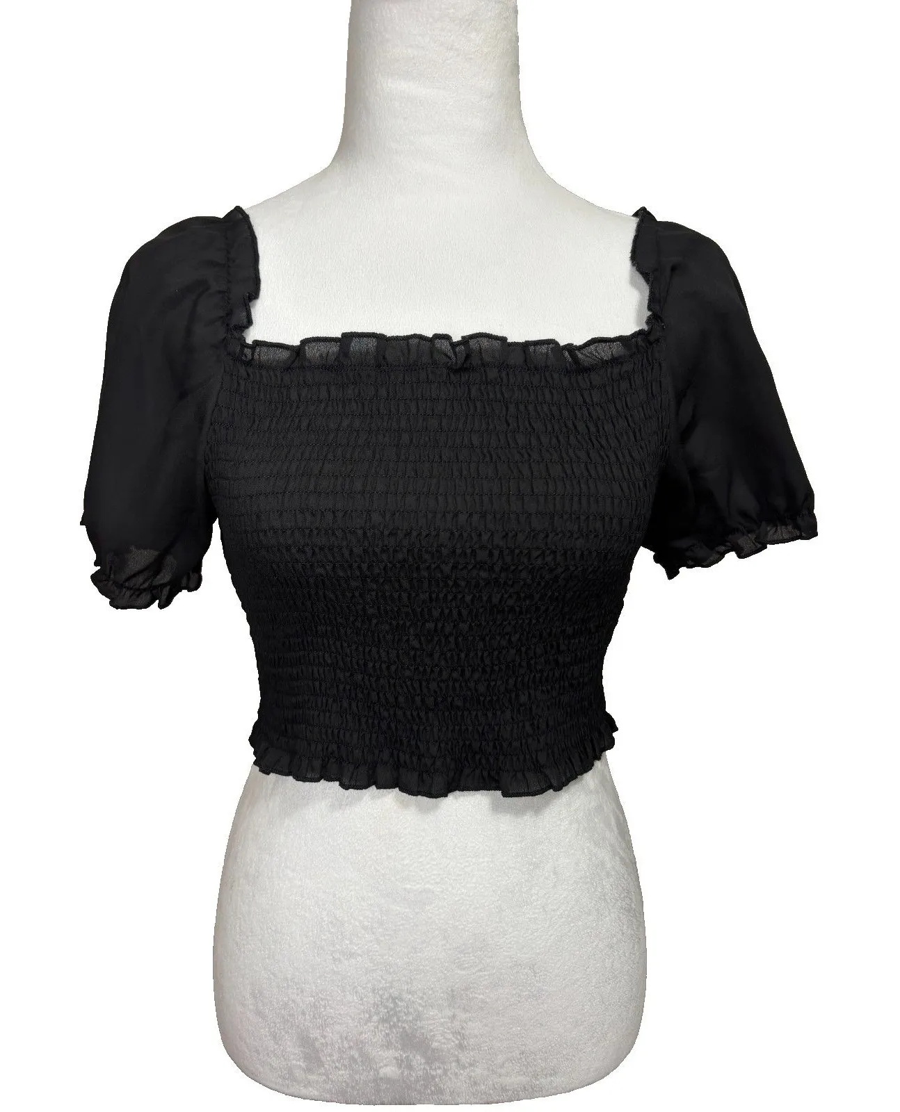 Brand: Shein Size: Small Color: Black Sleeve length: Short Features: Crop top, puff sleeve, ruffled... Show more