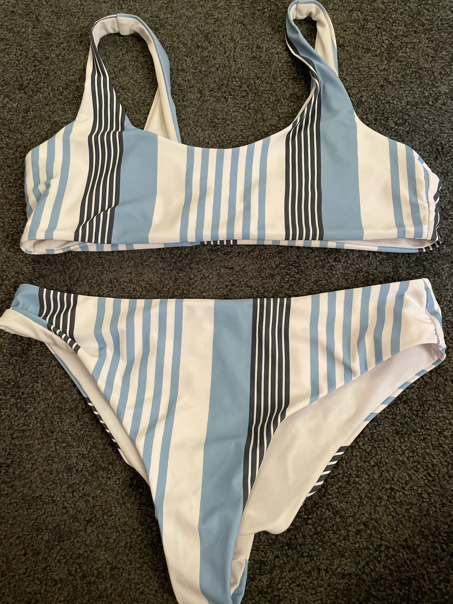 blue white and black stripped bikini, really cute, don’t really wanna wear anymore but it good condi... Show more