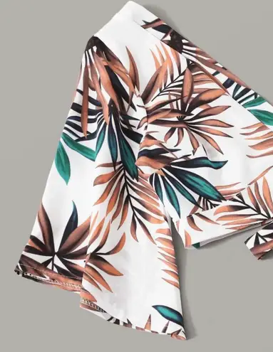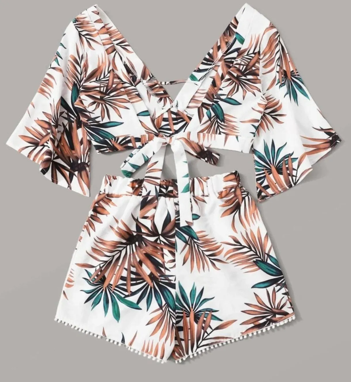A woven tropical leaf print set featuring a crop top with a plunging V-neckline and back with a supp... Show more