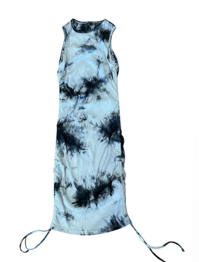 Trendy ribbed dress with a black and white tie-dye design. Ideal for casual wear.