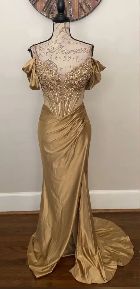 New with tags! Stunning mermaid style beaded corset gold prom dress, formal dress or pageant evening gown. Sheer corset bodice with detachable off shoulder straps. Lace up corset back, tag sz 8. From designer Ladivine. Prom dress, formal dress, evening gown, military ball, army ball, marine ball, Miss pageant gown, ms mrs crowning, gala, Vegas, wedding guest, black tie gala, cruise, Bollywood wedding dress mother of the bride dress MOB dress, mother of the groom dress, dubai wedding Victorian homecoming dress, black mermaid prom dress teen pageant, photo shoot, gatsby party, retro, vintage, roaring 20s theme, engagement photos, date night, nationals level gown, sexy, shiny tight prom dress, fitted form fitting, black wedding dress, cocomelody, David’s bridal, cocomelody glam Bollywood Dubai wedding guest dress Albina dyla , long sleeve wedding dress, party dress, wedding, bridesmaid, red carpet, Sherri hill, Vegas, abyss by abby, Mac duggal, Rachel Allen, Tarik ediz, old Hollywood, red carpet, gala, mrs pageant, miss pageant, appearance wear