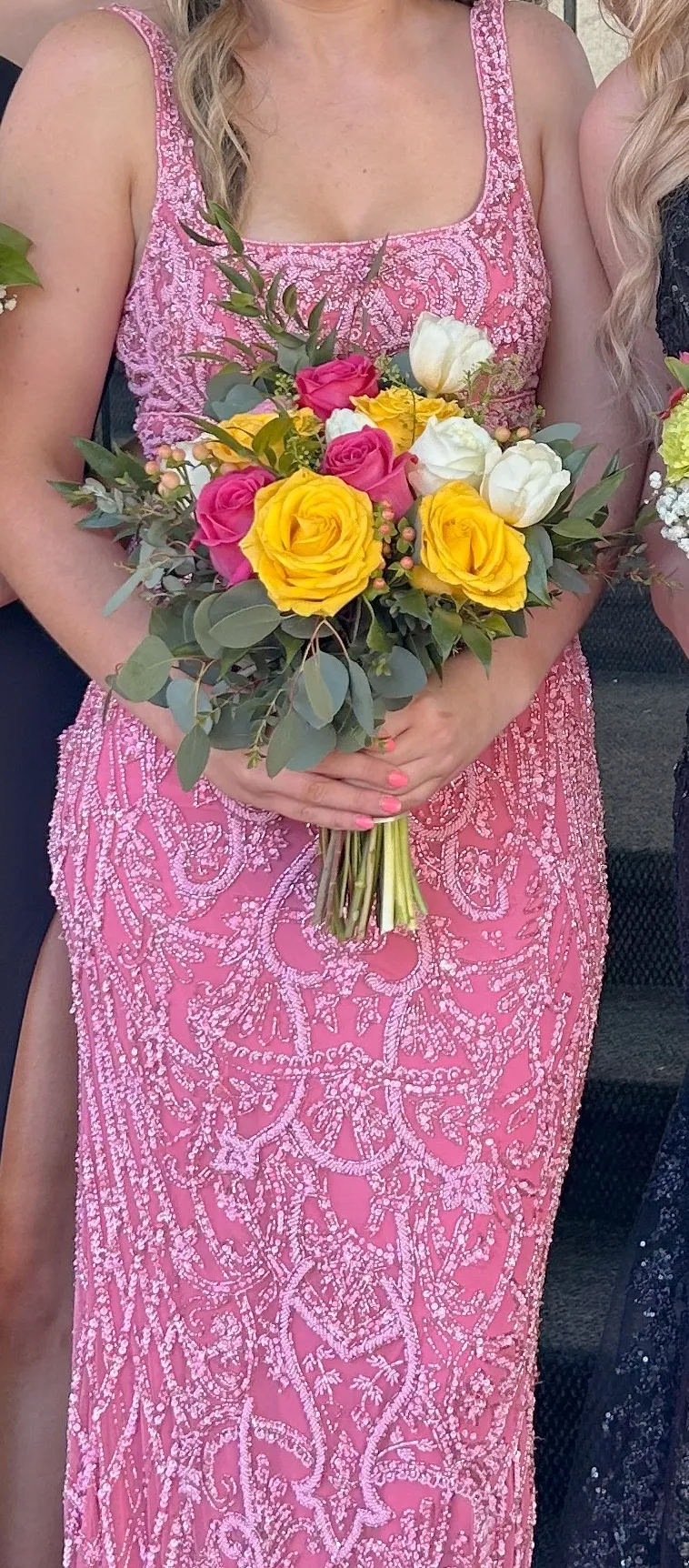 Pink Sherri hill beaded gown Fits good, and can be made tighter or looser with a corset string back... Show more
