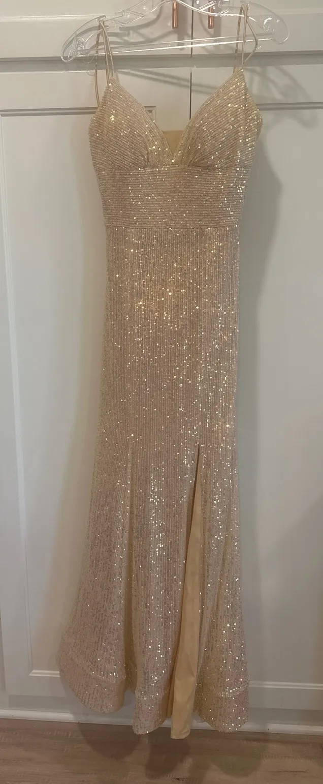 Keywords: Sherri Hill dress, sequin gown, prom dress, formal dress, evening gown, open back dress, slit dress, gold dress, beige dress, size 8 dress, spaghetti strap dress, special occasion dress, pageant dress, party dress, maxi dress