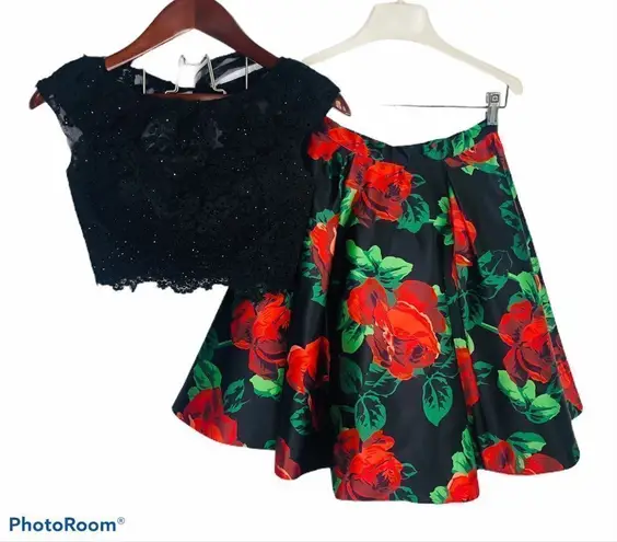 Sherri Hill 2 Piece Rose Print Dress Style 50603 0 Size 0 No flaws Black lace open back top Rose flo... Show more