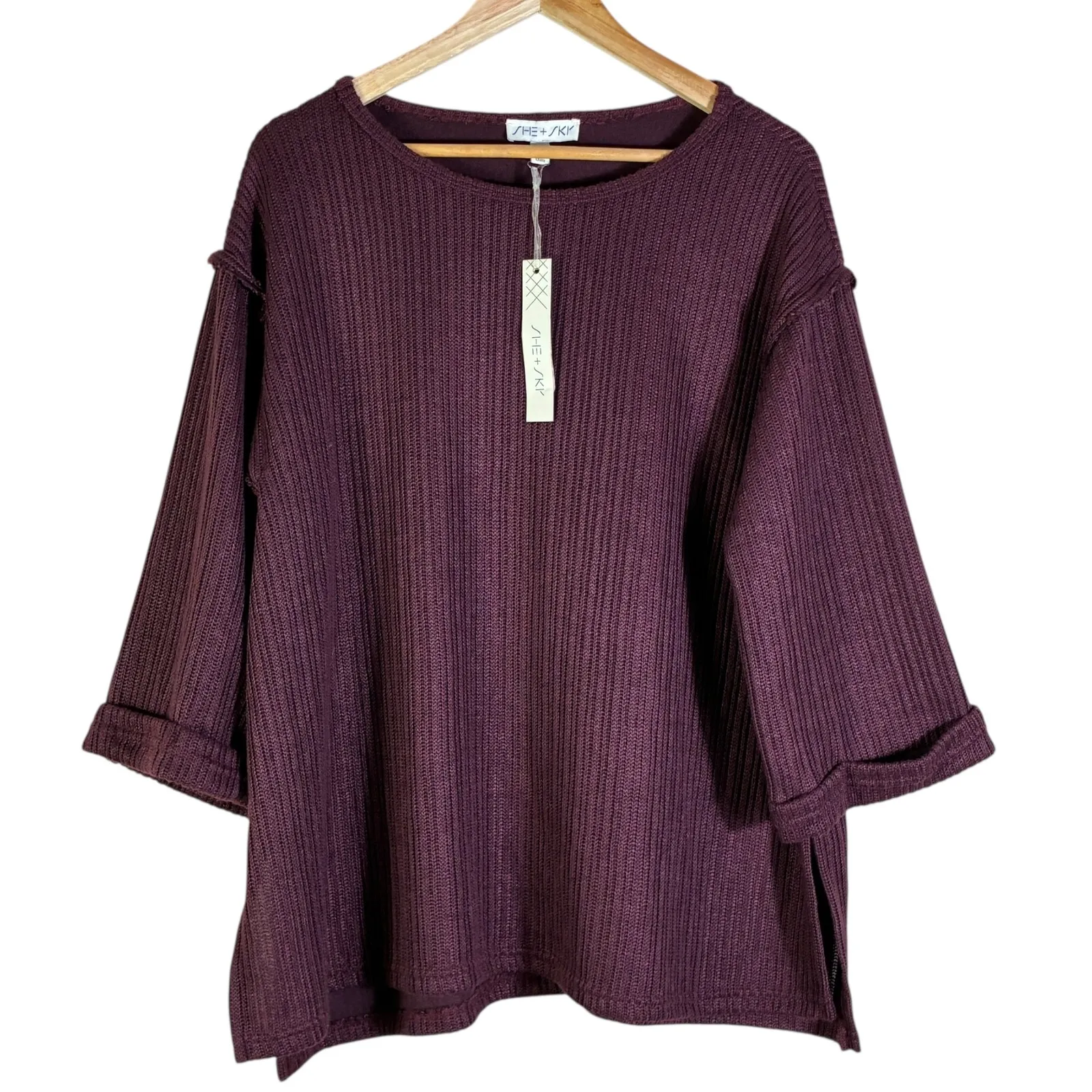 A burgundy ribbed knit tunic top by SHE+SKY. This relaxed fit top features 3/4 length sleeves with cuffed hems and a flattering split hemline. Its textured knit and comfortable silhouette make it perfect for a casual day out or a relaxed evening. Type: T-Shirt Department: Women Style: Tunic Material: Polyester Neckline: Round Neck Sleeve Length: 3/4 Sleeve Sleeve Type: Casual Sleeve Pattern: Solid Features: Oversized Fit: Relaxed Fabric Type: Knit Occasion: Casual Closure: Pullover Season: Spring, Fall Garment Care: Hand Wash Only Keywords: she + sky, burgundy top, ribbed knit, tunic, relaxed fit, 3/4 sleeve, cuffed sleeves, split hem, casual, fall fashion, winter wear, plus size, oversized Approx.Measurements