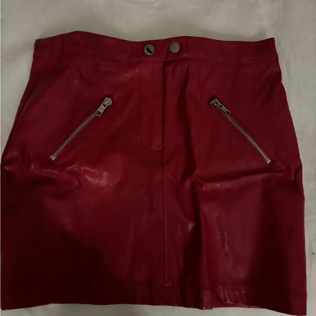 Bold red mini skirt by Shinestar. Features sleek zipper accents. Perfect for a standout look.