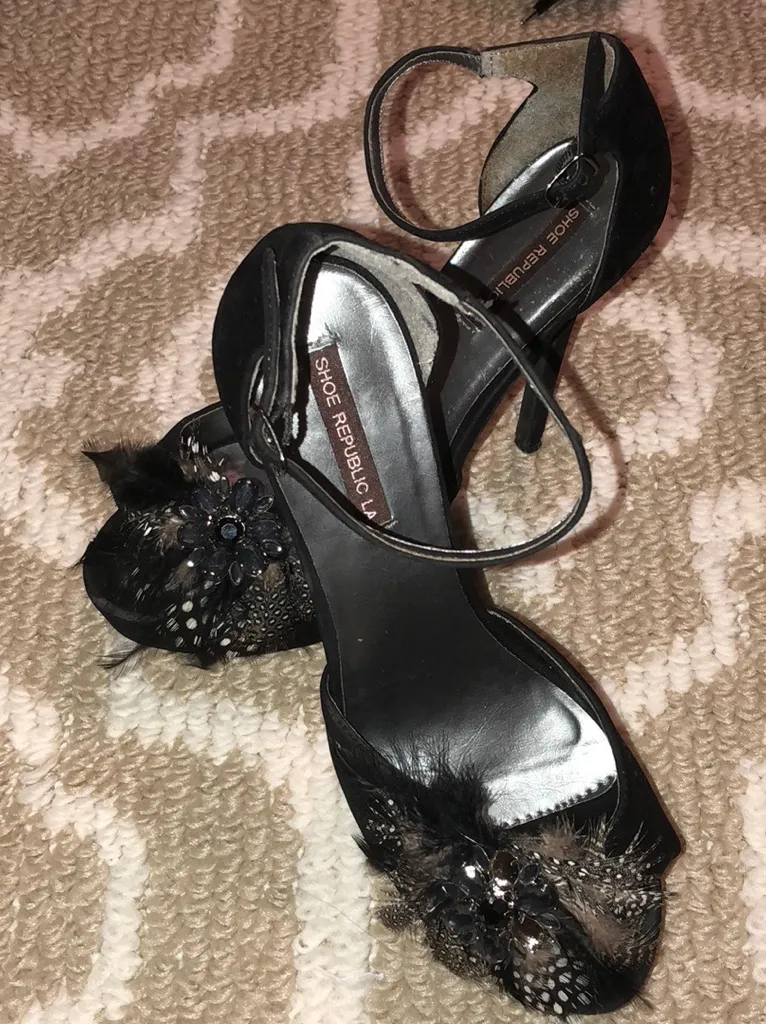 Size 10 black suede heels with feathers and jewels - $8 - From Geneva