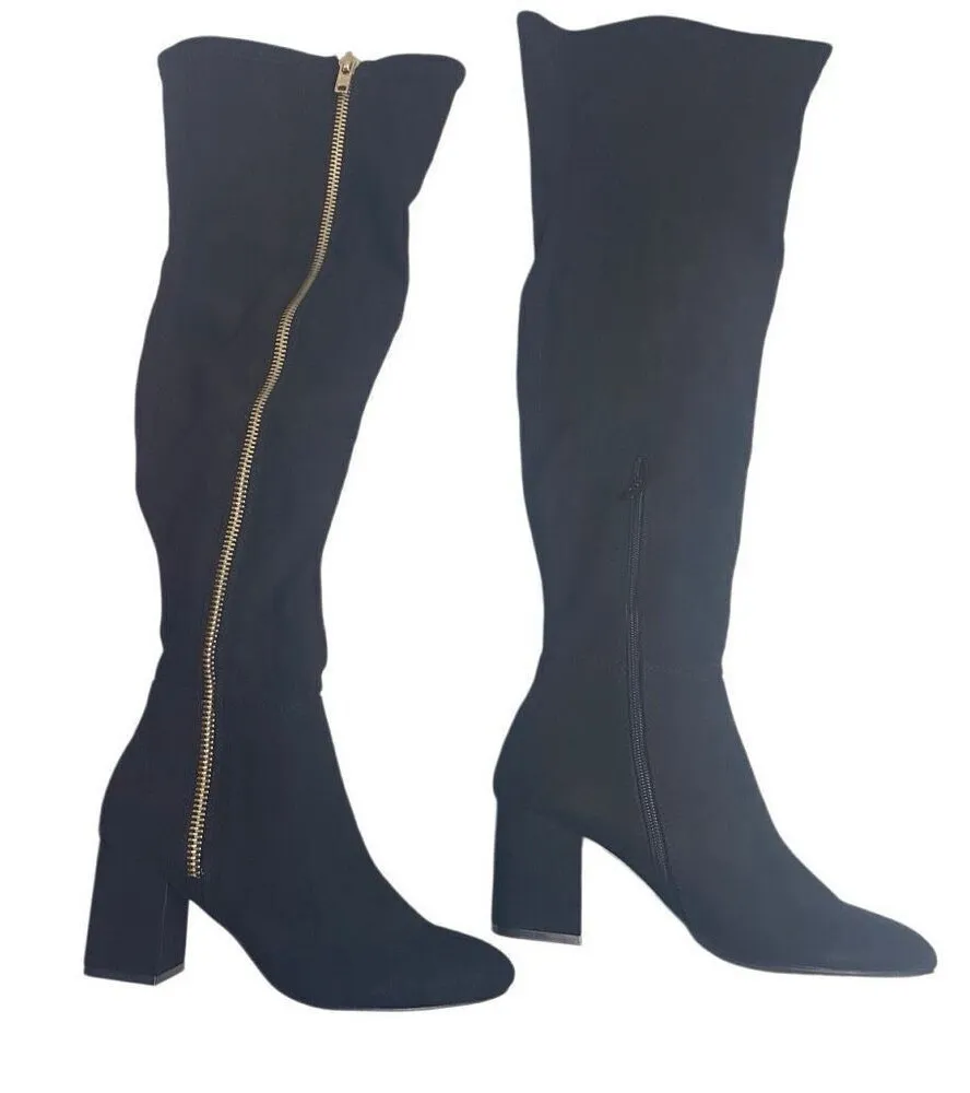 BRAND: ShoeDazzle COLOR: Black CONDITION: New With Box SIZE: 7WC ( Wide Calf) MEASUREMENTS: See Pictures MATERIALS: Textiles & Man Made OTHER DETAILS: Knee Boots Functional inside calf 10” zipper Faux Gold outside calf zipper (non working) Heel 2.5” Please see approximate measurements in pictures before purchasing. Use your own judgment as to the fit.