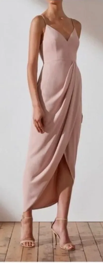 Excellent preowned condition US womens size 2. Shona Joy dress Core Cocktail draped midi dress. Light pink coral color. 100% poly Hand wash cold Unlined Hidden back zipper closure Pleated waist detail Surplice tulip style skirt Keywords: Event, wedding, bridesmaid, occasion, formal, black tie,
