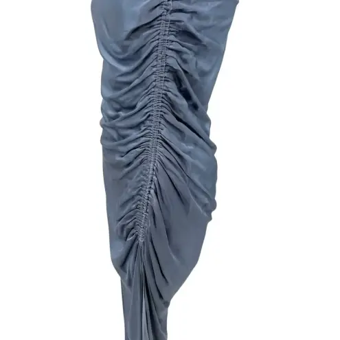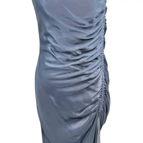 Brand new with tags Shona Joy Lily Bias Ruched Midi Dress in Blue Smoke Silk touch fabric Luxurious sheen Ruched side split Adjustable rouleau straps at back Invisible back zip Midi length skirt 100% viscose; lining: 100% polyester Size US 6 Armpit to armpit is approx 16" Waist is approx 13.5" Hip is approx 18" Length is approx 57"
