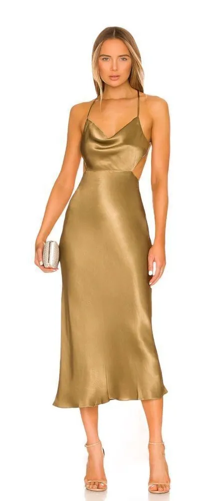 Shona Joy Thalia Bias Cut Out Midi Dress in Cumin Size Aus 12/US 8 Preloved **Size tag was removed, please take a look at the measurements before purchasing. **This dress has a beautiful shinny fabric that will wrinkle during the shipping process, please be aware that upon receiving the dress, it might need to be steam so it go back to its original shape. Approx Measurements Length 48" from chest Waist 14.5" Website Details Self: 58% lenzing, 42% viscose Lining: 100% poly Made in China Hand wash Fully lined Hidden back zipper closure Adjustable shoulder straps Open back with crisscross styling Sheen satin fabric Revolve Style No. SHON-WD404 Manufacturer Style No. 221263