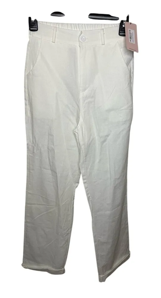 Crisp, modern lines define these new Shop Micas trousers, a versatile staple for any wardrobe. The bright white hue offers a clean, fresh look, enhanced by the flattering high waist design. With a comfortable elasticated waistband and classic straight leg, these pants combine ease of wear with timeless style. The cuffed hem adds a touch of relaxed sophistication, making them perfect for a casual brunch, a day at the office, or an evening out. Keywords: Shop Micas, White pants, High waist trousers, Straight leg pants, Elastic waist, Cuffed hem, Casual pants, New with tags, womens pants, XS, Trousers, Comfortable pants, Dress pants, Summer pants