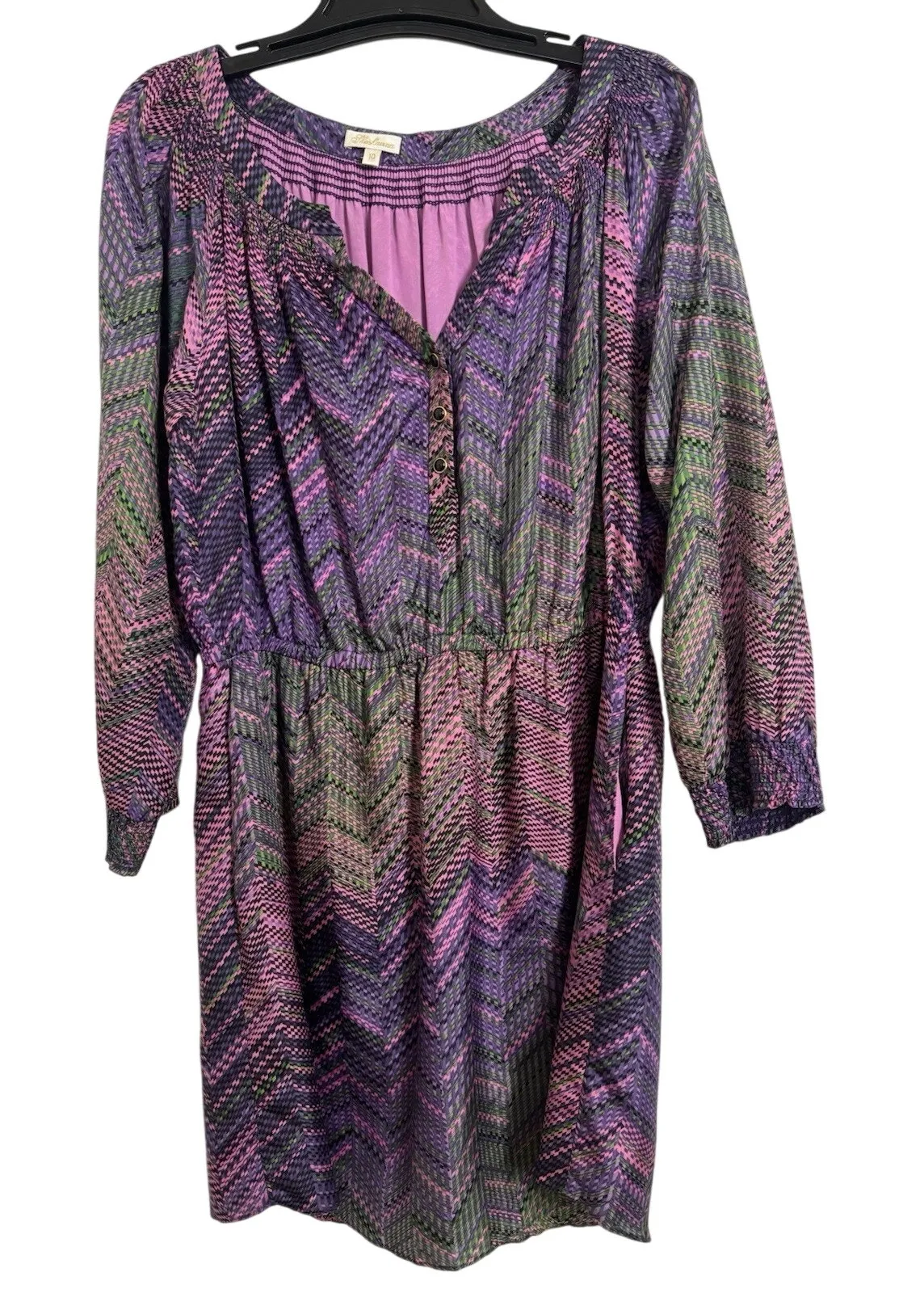 Guest Shoshanna Women’s Size 10 Multicolor Long Sleeve Dress Knee Length V Neck Button Detail Smocked Cuffs Elastic Waist Pockets Fully Lined Shell: 100% Silk Lining: 100% Polyester Length 37” Pit to Pit 21” Excellent COndition Wedding guest dress, party dress, holiday party EE014