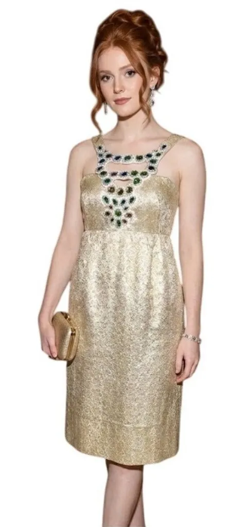 This knee-length fitted cocktail dress by Shoshanna features a metallic jacquard gold fabric blend with a glimmering jeweled neckline. Sleeveless with a zippered back closure, it exudes elegance and sophistication. • Show stopping jewel-trimmed neckline • Built-in bra • Shimmering Jacquard fabric made from premium acetate-cotton-metallic blend • Zippered back closure Approx. Measurements taken flat with a tailor’s tape Chest: 16 inches Waist: 13 inches Length: 35.5 inches Please note the model picture is meant to be an example illustration and not an exact representation. Pageant, Prom, Black Tie, Gala, Hoco, formal wear, elegant, evening wear, cocktail, ball, wedding guest, bridesmaid, date night, dressy, chic, special occasion, bachelorette, school dance, homecoming, red carpet, elopement Please note as is common with many special occasion wear items, sizes do not correspond to street sizes and can often be different by as much as 2 sizes (I.e. formal wear size 12 may = street size 8). Please look at measurements provided to avoid disappointment.