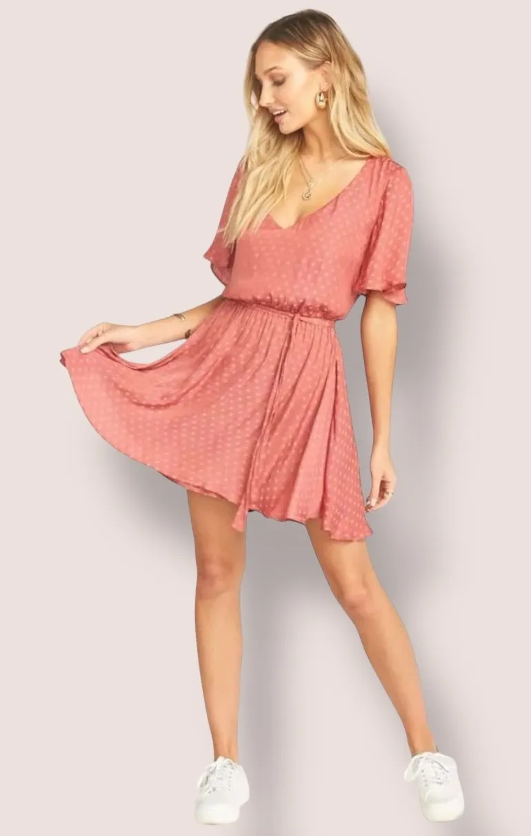 Feminine and chic, the Show Me Your Mumu Anastasia Dress is the everyday, everywhere dress. In sangria blush, it features a wrap-around belt, deep V neckline, flutter sleeves, and flouncy A-line skirt. Perfect balance of casual and elevated style.