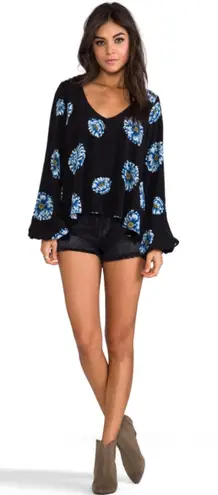 Chic black top with vibrant blue floral pattern. Flowy long sleeves. Perfect for casual outings.