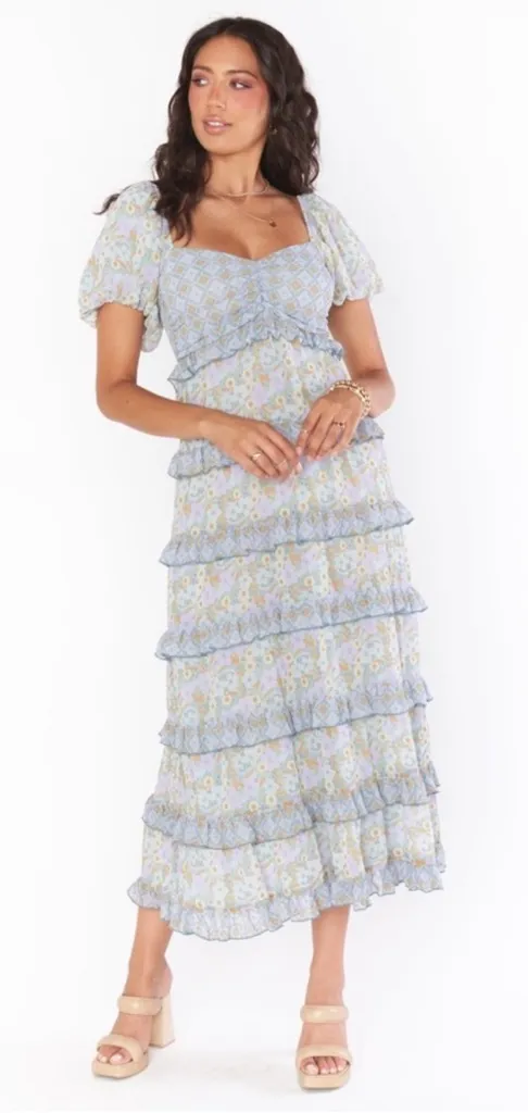 Elegant midi dress with floral print. Features puff sleeves and tiered skirt. Perfect for versatile... Show more