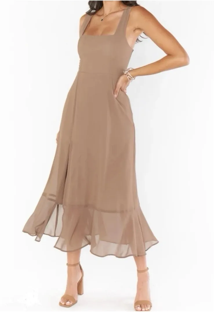 Soft beige chiffon midi dress by Show Me Your Mumu from the Weddings collection. Features a flatteri... Show more