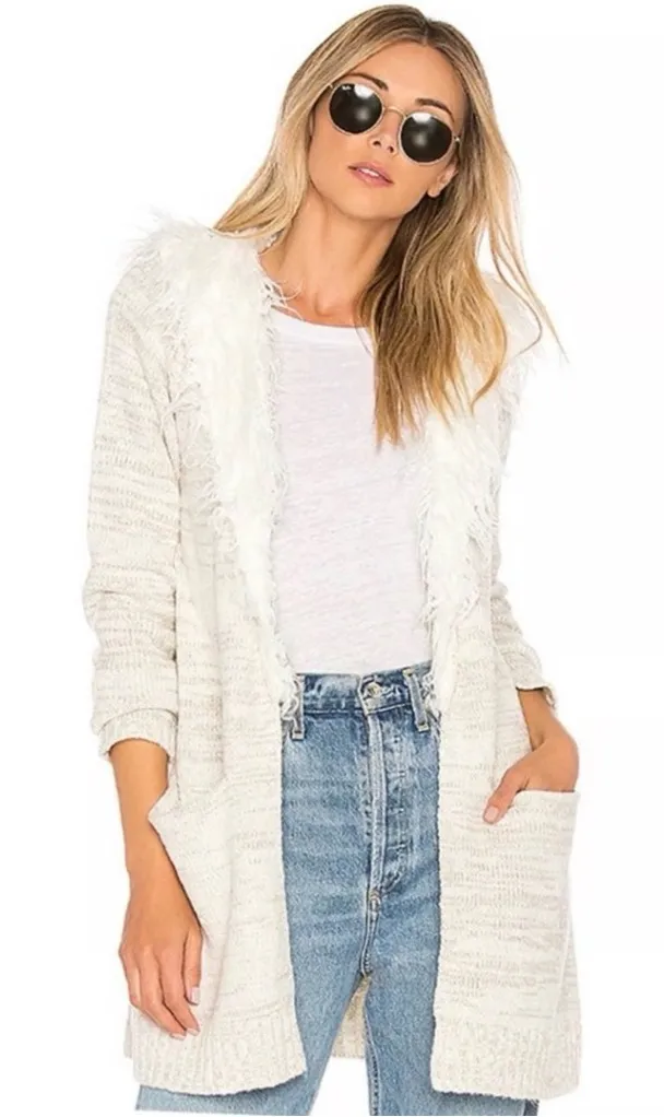 Chic cream cardigan with soft faux fur trim. Open-front style. Ideal for layering.