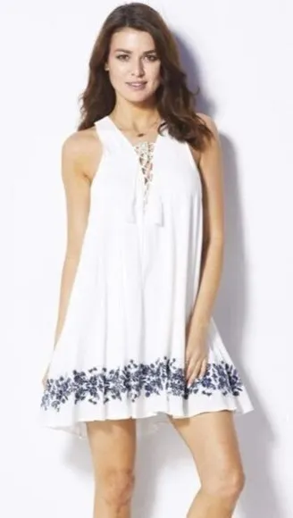 Shift dress with navy blue flowers and leaves embroidered around bottom hem. V-neckline with lace-up... Show more