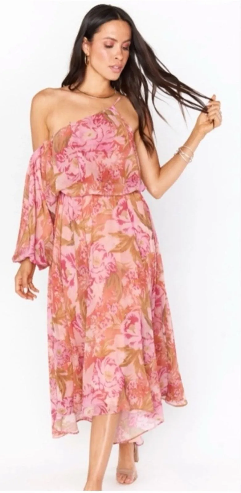 Embrace elegance with this stunning floral off-shoulder dress. Perfect for any occasion, its vibrant pink and orange hues add a touch of charm to your wardrobe.