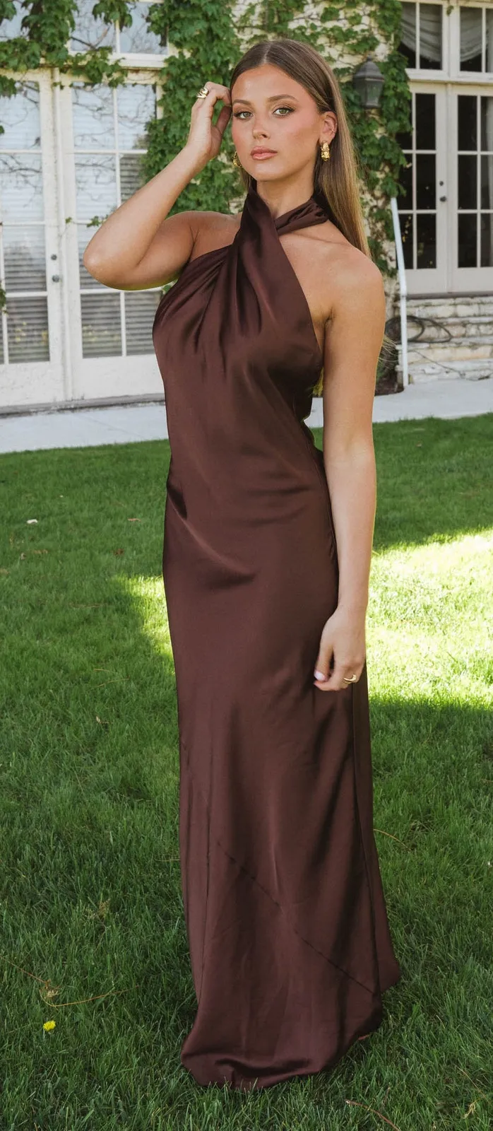 Show Me Your Mumu Jasmine Halter Maxi Dress Chocolate Luxe Satin Size XXS New without tags The Jasm... Show more