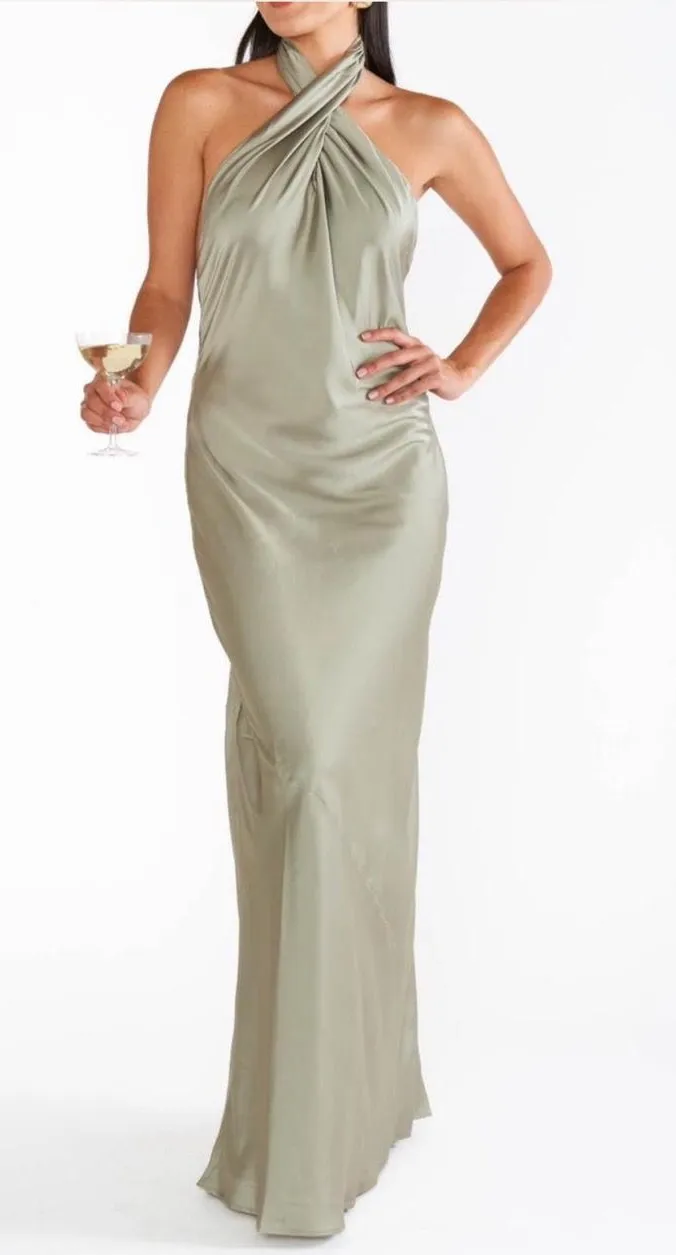 Show me your mumu, Jasmine halter maxi dress Worn once Color: Moss Green Luxe Satin Gently worn as b... Show more
