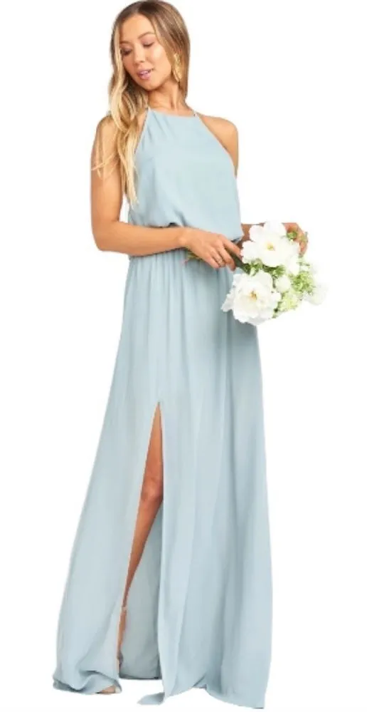Show Me Your Mumu Bridesmaid Heather Halter Dress in Silver Sage Crisp Size Large Condition is Bran... Show more