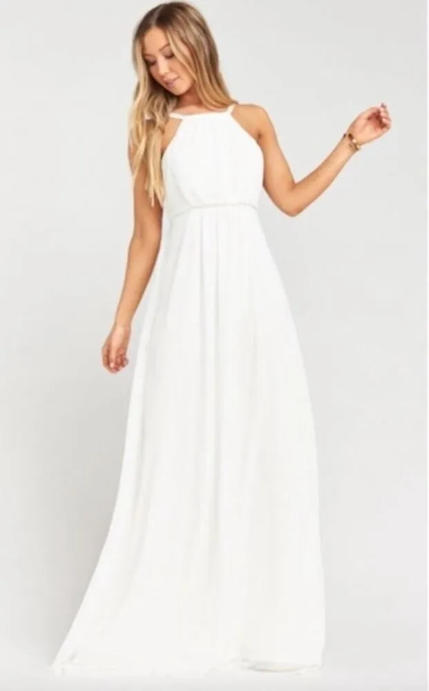 Color: wedding cake WC24 High neckline Open back Cinched empire waist Lined The Amanda Maxi dress i... Show more